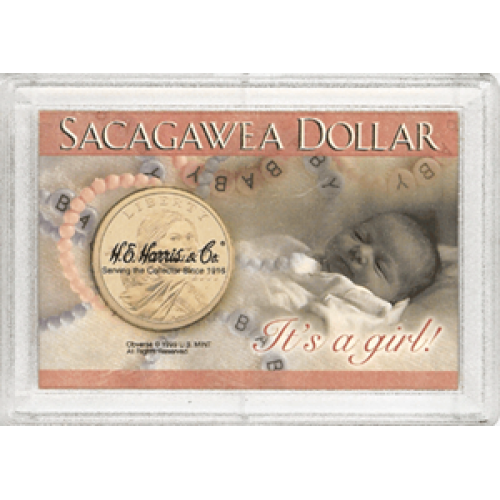 This HE Harris Frosty Case will hold 1 Sacagawea Dollar and is not dated. This case design features a newborn baby girl snuggled in a pink cradle and reads It's a Girl! Designed for coin display or long-term storage, this product and its inert are made of durable materials that will not harm coins. Size: 2x3