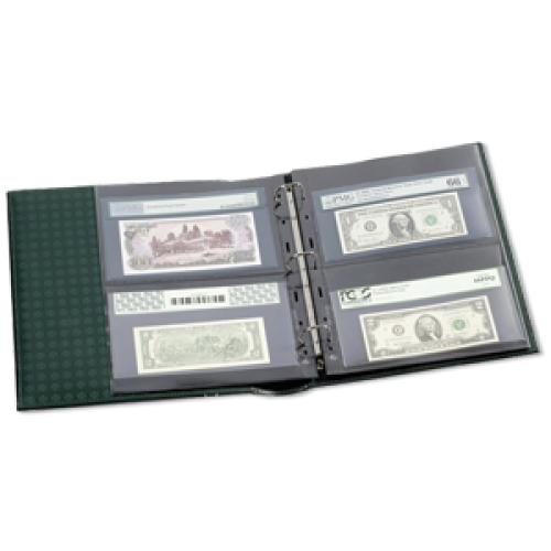 Elegant leatherette cover with matching slipcase, fine stitching in bookbinder's quality, sturdy 3 D-ring mechanism for 20 plus certified notes. Fits PMG and PCGS graded currency. Each album comes with 10 Grande 2c pages and 11 black interleaves.