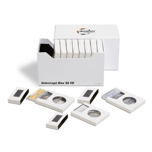 The new line of LIGHTHOUSE storage boxes provide active protection against tarnishing thanks to patented INTERCEPT TECHNOLOGY. All glossy white boxes are manufactured of sturdy inert materials and are archival quality. Each box is equipped with INTERCEPT TECHNOLOGY? lining which purifies the atmosphere inside the box. They are suitable for the storage and preservation of coins made of cooper, bronze, silver, and gold. The Intercept box IBDPSL10 holds 10 slabs (incl. PCGS, NGC, ANACS, EVERSLAB, QUICKSLAB, and many others) in 10 single slab boxes which are also included. A double layer of Intercept Technology(TM) material is provided due to the combination of single slab sleeve and the outer box. The result is the ultimate in tarnish protection.