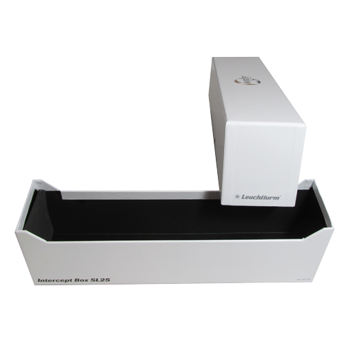 The new line of LIGHTHOUSE storage boxes provide active protection against tarnishing thanks to patented INTERCEPT TECHNOLOGY?. All glossy white boxes are manufactured of sturdy inert materials and are archival quality. Each box is equipped with INTERCEPT TECHNOLOGY? lining which purifies the atmosphere inside the box. They are suitable for the storage and preservation of coins made of cooper, bronze, silver, and gold. The Intercept box IBSL25 holds 25 slabs. It is made to hold the most widely used slabs or rectangular coin capsules, including PCGS, NGC, ANACS, EVERSLAB, QUICKSLAB, and many others. It comes with stoppers to prevent contents from falling when the box is not completely filled.