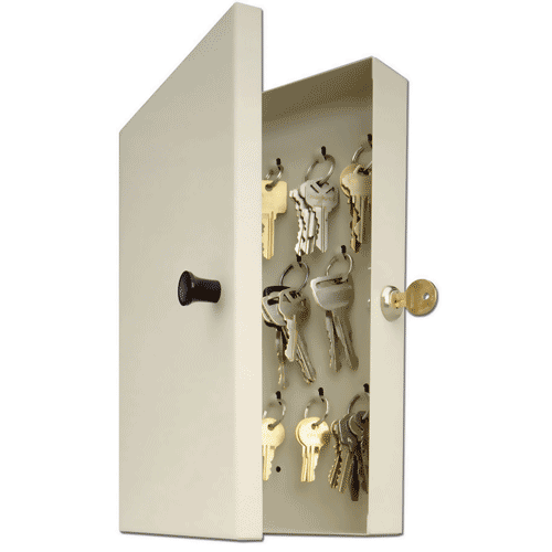 Convenient way to organize keys. Simply place any key ring or tag on the hooks. Made of heavy-gauge steel. Locks and comes with two keys.