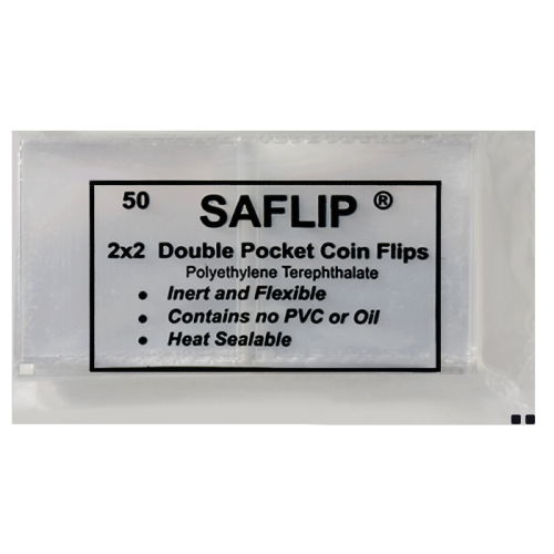 These SAFLIP brand 2x2 Coin Flips are sold in packs of 50. These are double pocket coin flips for long term storage. These flips do not contain vinyl, or polyvinyl cloride.