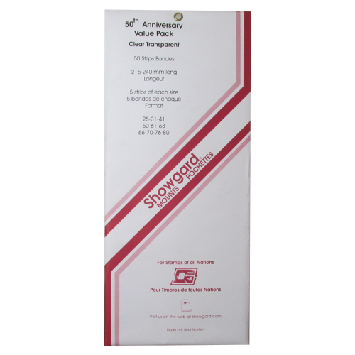 This 50th Anniversary mount set contains 5 strips each of the most needed strip style mounts for US singles and blocks- 10 different sizes, 50 strips in all between No. 22 and No. 80.