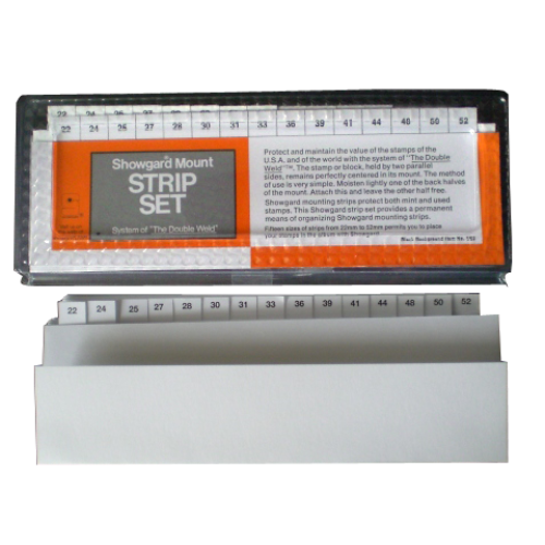 This set contains 5 black strips each of the most popular Showgard Mounts for single stamps in an indexed, refillable storage tray.