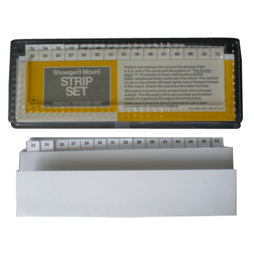 This set contains 5 clear strips each of the most popular Showgard Mounts for single stamps in an indexed, refillable storage tray.