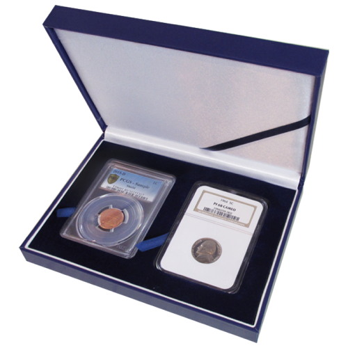 This Guardhouse display box is made to store 2 certified coin slabs. This box will accommodate your certified coin from any of today's major grading companies such as PCGS, NGC and ANACS. It Features beautifully handcrafted leatherette with gold trim on the lid. Guardhouse provides you with superior quality at a great price!