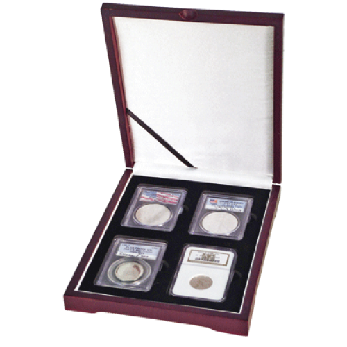 This Guardhouse display box is made to store 4 certified coin slabs. This box will accommodate your certified coin from any of today's major grading companies such as PCGS, NGC and ANACS. It Features a beautiful real Mahogany wood finish and a protective wood top. Guardhouse provides you with superior quality at a great price!