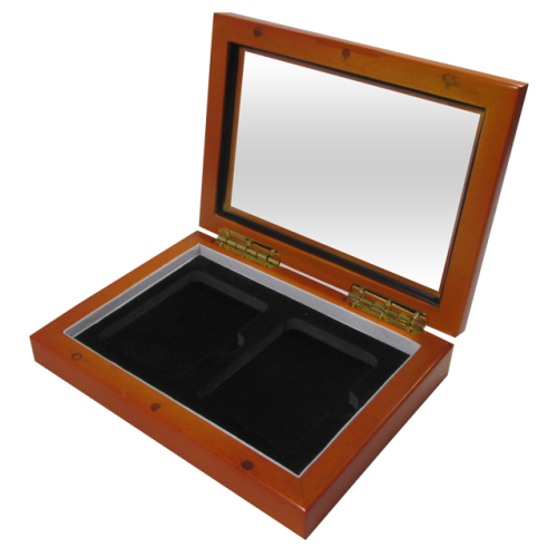 This wooden glass top display box holds and displays two PCGS, NGC or similarly sized coin slabs. Hand-made with real wood, this beautiful glass top box features a flocked memory foam insert inside a white collar and sturdy, gold-colored inset hinges and magnet closures. Perfect for packaging, gifts and coin display. !
