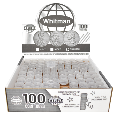 Our price is for a box of 100 Quarter size Whitman Round Coin Tubes. These tubes are made of crystal clear polystyrene and come with a twist-off cap.