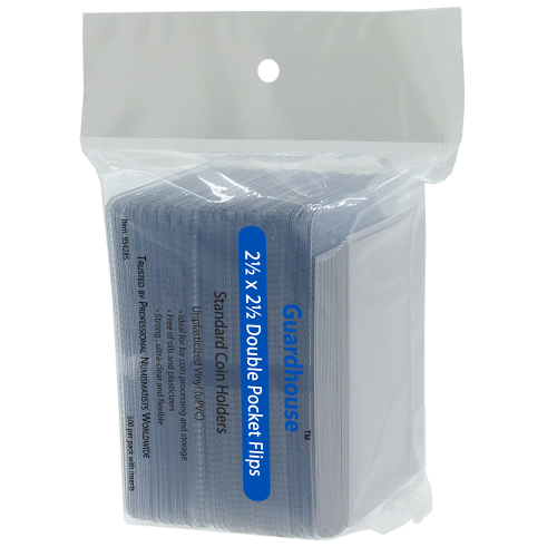 Pre-separated, 7mil, double polished unplasticized vinyl flips are a safe and reliable way to store and process coins. Guardhouse flips do not require tearing to separate and feature rounded corners that will not poke or cut your hands. These flips are about 20% thicker than other standard coin flips, and designed for medium to long term storage needs. !