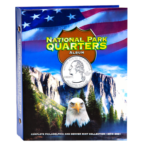 National Park Quarters Album P and D Mints, 2010-2021, Full Color Cover. Features Whitman's thumb-notch design pages for easy window removal. 112 Openings, 7 Pages.