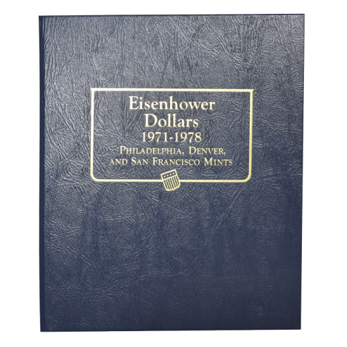 The is the Whitman "IKE" Eisenhower Dollars Coin Album dated from 1971 through 1978 with a total of 35 ports. Whitman Coin Albums are easy to identity by their blue leatherette textured exterior and page notches. These notches make it very easy to remove the clear slides to gain access to your coins.