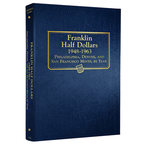 The is the Whitman Franklin Half Dollars Coin Album dated from 1948 through 1963 with a total of 36 ports. Whitman Coin Albums are easy to identity by their blue leatherette textured exterior and page notches. These notches make it very easy to remove the clear slides to gain access to your coins.