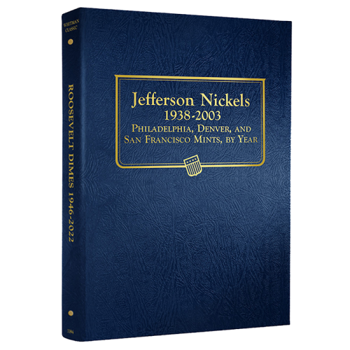 The is the Whitman Jefferson Nickels Coin Album dated from 1938 through 2003 with a total of 180 ports. Whitman Coin Albums are easy to identity by their blue leatherette textured exterior and page notches. These notches make it very easy to remove the clear slides to gain access to your coins.