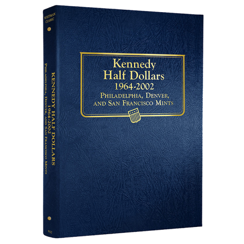 The is the Whitman Kennedy Half Dollars Coin Album dated from 1964 through 2002. There are ports for the P,D and S minted coins. Grand total of 112 ports (no ports to hold both the S Clad and S Silver). Whitman Coin Albums are easy to identity by their blue leatherette textured exterior and page notches. These notches make it very easy to remove the clear slides to gain access to your coins.