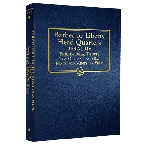 The is the Whitman Liberty Head / Barber Quarters Coin Album dated from 1892 through 1916 with a total of 74 ports. Whitman Coin Albums are easy to identity by their blue leatherette textured exterior and page notches. These notches make it very easy to remove the clear slides to gain access to your coins.