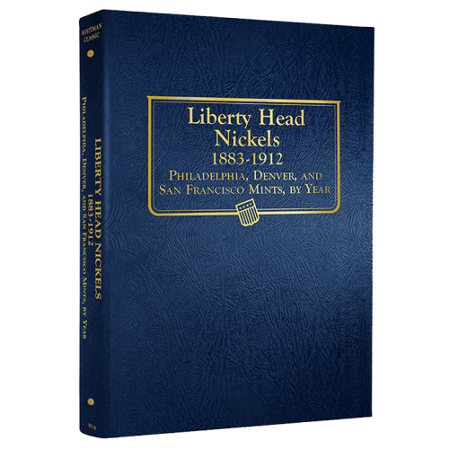 The is the Whitman Liberty Nickels Coin Album dated from 1883 through 1912 with a total of 33 ports. Whitman Coin Albums are easy to identity by their blue leatherette textured exterior and page notches. These notches make it very easy to remove the clear slides to gain access to your coins.