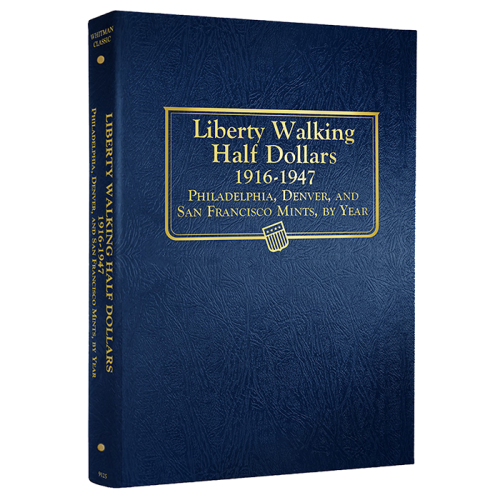 The is the Whitman Liberty Walking Half Dollars Coin Album dated from 1916 through 1947 with a total of 65 ports. Whitman Coin Albums are easy to identity by their blue leatherette textured exterior and page notches. These notches make it very easy to remove the clear slides to gain access to your coins.