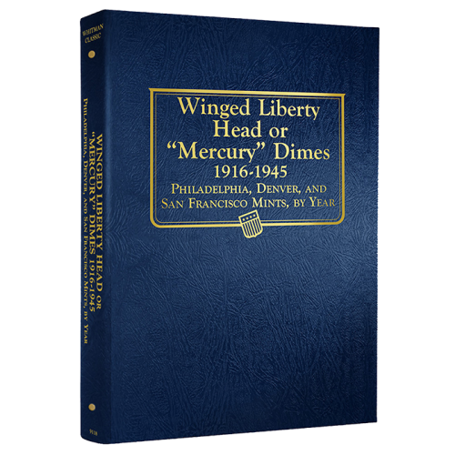 The is the Whitman Mercury Dimes Coin Album dated from 1916 through 1945 with a total of 80 ports. Whitman Coin Albums are easy to identity by their blue leatherette textured exterior and page notches. These notches make it very easy to remove the clear slides to gain access to your coins.