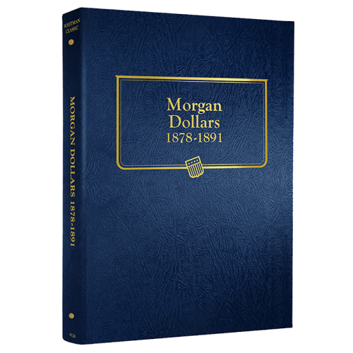 The is the Whitman Morgan Dollars Coin Album dated from 1878 through 1891 with a total of 54 ports. Whitman Coin Albums are easy to identity by their blue leatherette textured exterior and page notches. These notches make it very easy to remove the clear slides to gain access to your coins.