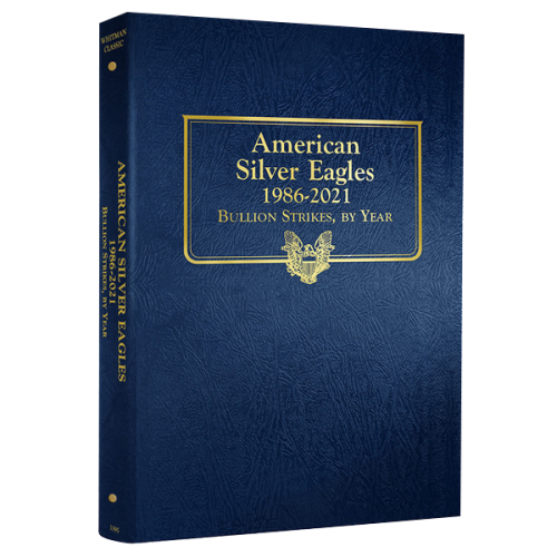 Strong, soil-resistant Whitman albums with blue textured leatherette cover are designed with thumb notches for easy window removal. Silver Eagles 1986-2021. Additional openings with no dates.