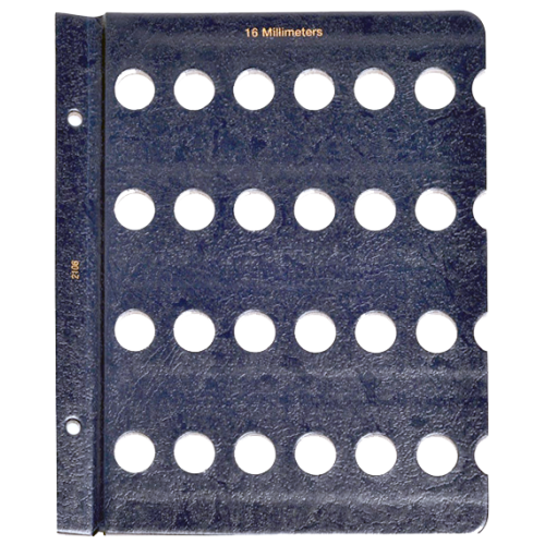 This blank Whitman page is made to hold your 16mm size coins and contains a total of 24 unlabeled ports. These Whitman pages have a classic blue texture, 16 Millimeters is printed at the top and feature notches. These notches make it easy to remove the clear slides to gain access to your coins. Plastic slides included.