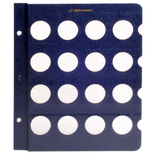 This blank Whitman page is made to hold your 27mm size coins and contains a total of 16 unlabeled ports. These Whitman pages have a classic blue texture, 27 Millimeters is printed at the top and feature notches. These notches make it easy to remove the clear slides to gain access to your coins. Plastic slides included.