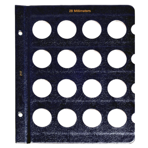 This blank Whitman page is made to hold your 28mm size coins and contains a total of 16 unlabeled ports. These Whitman pages have a classic blue texture, 28 Millimeters is printed at the top and feature notches. These notches make it easy to remove the clear slides to gain access to your coins. Plastic slides included.