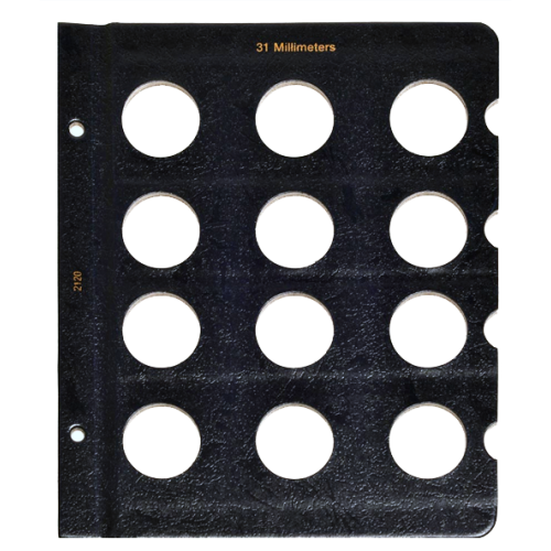 This blank Whitman page is made to hold your 31mm size coins and contains a total of 12 unlabeled ports. These Whitman pages have a classic blue texture, 31 Millimeters is printed at the top and feature notches. These notches make it easy to remove the clear slides to gain access to your coins. Plastic slides included.
