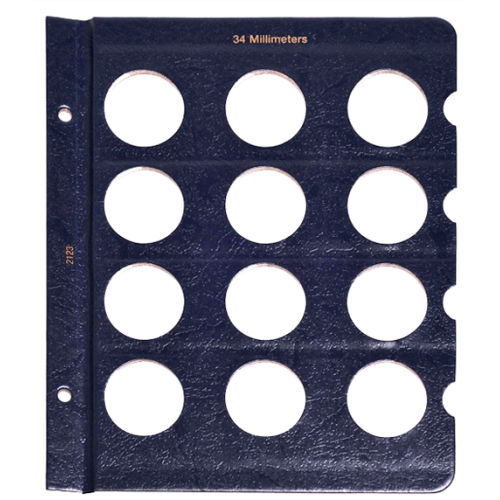 This blank Whitman page is made to hold your 34mm size coins and contains a total of 12 unlabeled ports. These Whitman pages have a classic blue texture, 34 Millimeters is printed at the top and feature notches. These notches make it easy to remove the clear slides to gain access to your coins. Plastic slides included.