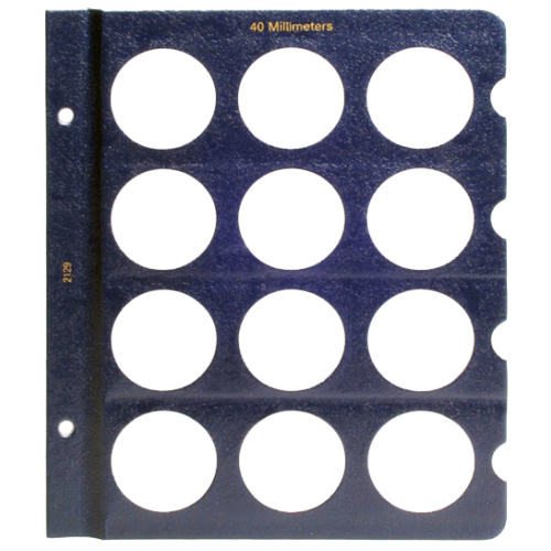 This blank Whitman page is made to hold your 40mm size coins and contains a total of 12 unlabeled ports. These Whitman pages have a classic blue texture, 40 Millimeters is printed at the top and feature notches. These notches make it easy to remove the clear slides to gain access to your coins. Plastic slides included.