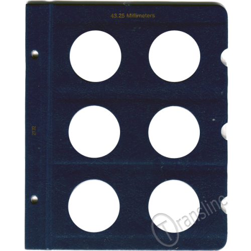 This blank Whitman page is made to hold your 43.25mm size coins and contains a total of 6 unlabeled ports. These Whitman pages have a classic blue texture, 43.25 Millimeters is printed at the top and feature notches. These notches make it easy to remove the clear slides to gain access to your coins. Plastic slides included.