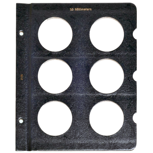 This blank Whitman page is made to hold your 50mm size coins and contains a total of 6 unlabeled ports. These Whitman pages have a classic blue texture, 50 Millimeters is printed at the top and feature notches. These notches make it easy to remove the clear slides to gain access to your coins. Plastic slides included.