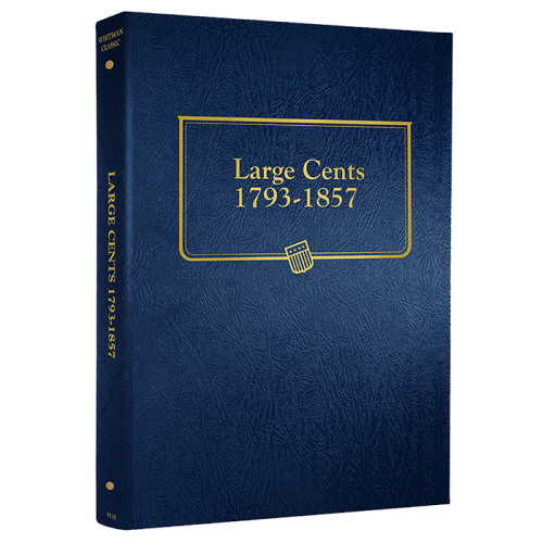 The is the Whitman Large Cents Coin Album dated from 1793 through 1857 with a total of 64 ports. Whitman Coin Albums are easy to identity by their blue leatherette textured exterior and page notches. These notches make it very easy to remove the clear slides to gain access to your coins.