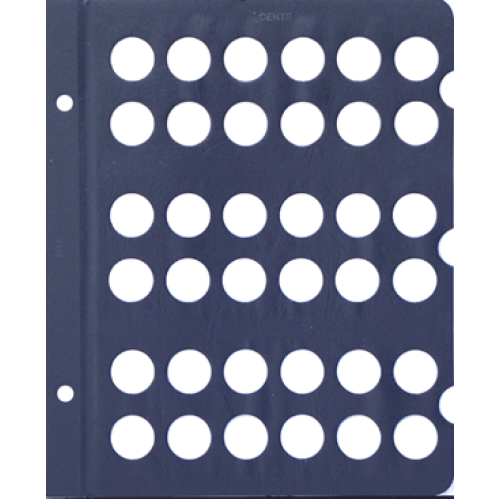 This blank Whitman page is made to hold your US cent size coins and contains a total of 36 unlabeled ports. These Whitman pages have a classic blue texture, Cents is printed at the top and feature notches. These notches make it easy to remove the clear slides to gain access to your coins. Plastic slides included.