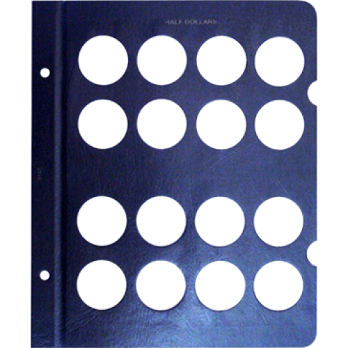 This blank Whitman page is made to hold your US Half Dollar size coins and contains a total of 16 unlabeled ports. These Whitman pages have a classic blue texture, Half Dollar printed at the top and features notches. These notches make it easy to remove the clear slides to gain access to your coins. Plastic slides included.