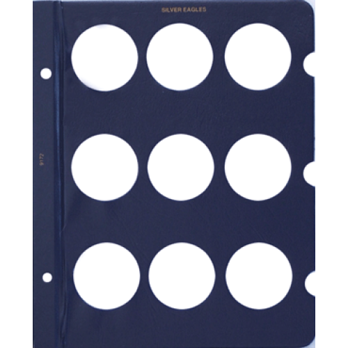 This blank Whitman page is made to hold your US Silver Eagle size coins and contains a total of 9 unlabeled ports. These Whitman pages have a classic blue texture, Silver Eagles is printed at the top and feature notches. These notches make it easy to remove the clear slides to gain access to your coins. Plastic slides included.