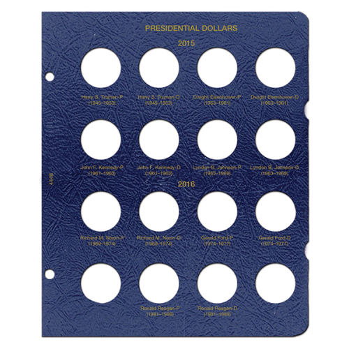 Page for Presidential Dollar Album. This page has been updated to include President Ronald Reagan. With openings for both P and D Mints. 16 openings.